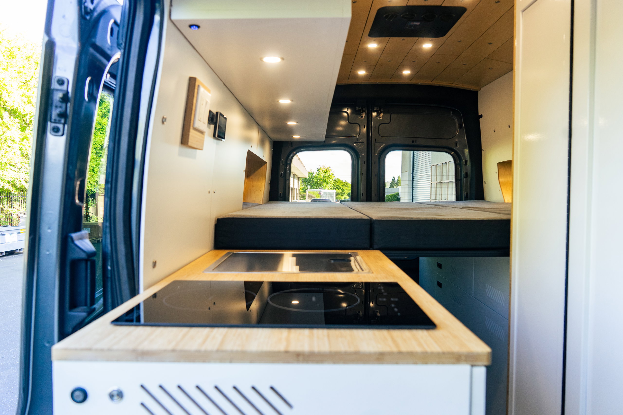 Your van is handcrafted in our Auburn, CA shop over 6–8 weeks. We use the same premium components in every build — Victron energy systems, Baltic birch cabinetry, bamboo countertops, Havlock wool insulation.